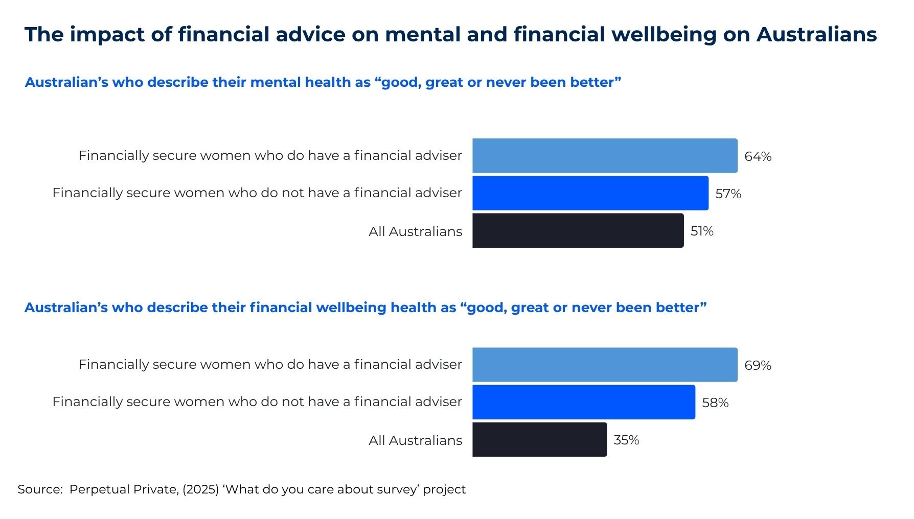 In Perpetual’s annual “What do you care about?” study, Australians were asked to describe both their current mental health and financial wellbeing. For women, having a financial adviser is associated with a significant improvement in both financial wellbeing and mental health.