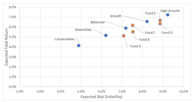 The chart also demonstrates how different superannuation providers use different labels for their various asset allocation strategies; Funds A through E are all labelled as a “Balanced” option but have widely varied levels of risk. This is an important consideration when comparing returns from superannuation fund providers as you are not comparing ‘apples with apples’ as the underlying asset allocation, and therefore the inherent risk, may be meaningfully different.