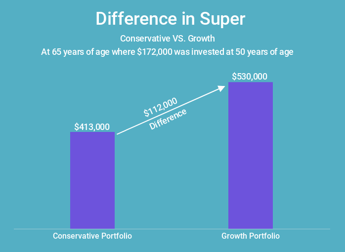 To illustrate this, consider a 50-year-old man with a super balance of $172,000 (the average balance according to research by the Association of Superannuation Funds of Australia).2 With approximately 15 years until retirement, the expected difference of investing in a conservative versus growth portfolio would account to approximately $112,000.* In this scenario, a conservative portfolio would have returned an expected 6.1% over 15 years for a balance of $418,000* and a growth portfolio would have returned an expected 7.8% for a balance over $530,000.*