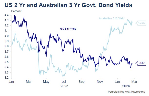 - US stock and bond markets were again relatively volatile, reflecting the market pricing the likely impact of AI on employment and business models of certain firms over the long-term. Software as a service companies’ share prices were particularly hard hit and a number of these companies have already announced hiring freezes or significant layoffs. Overall US ten-year bond yields ended the month 29bps lower, while the US market is now pricing three interest rate cuts by mid-2027. It seems that the longer end of the bond market is currently prepared to look well ahead for the impact of AI on employment. What happens directionally in US bonds, usually is reflected in Australian bond yields too. The Australian 10-year bond yield dropped 15bps over February and fell a further 8bps on the open today.