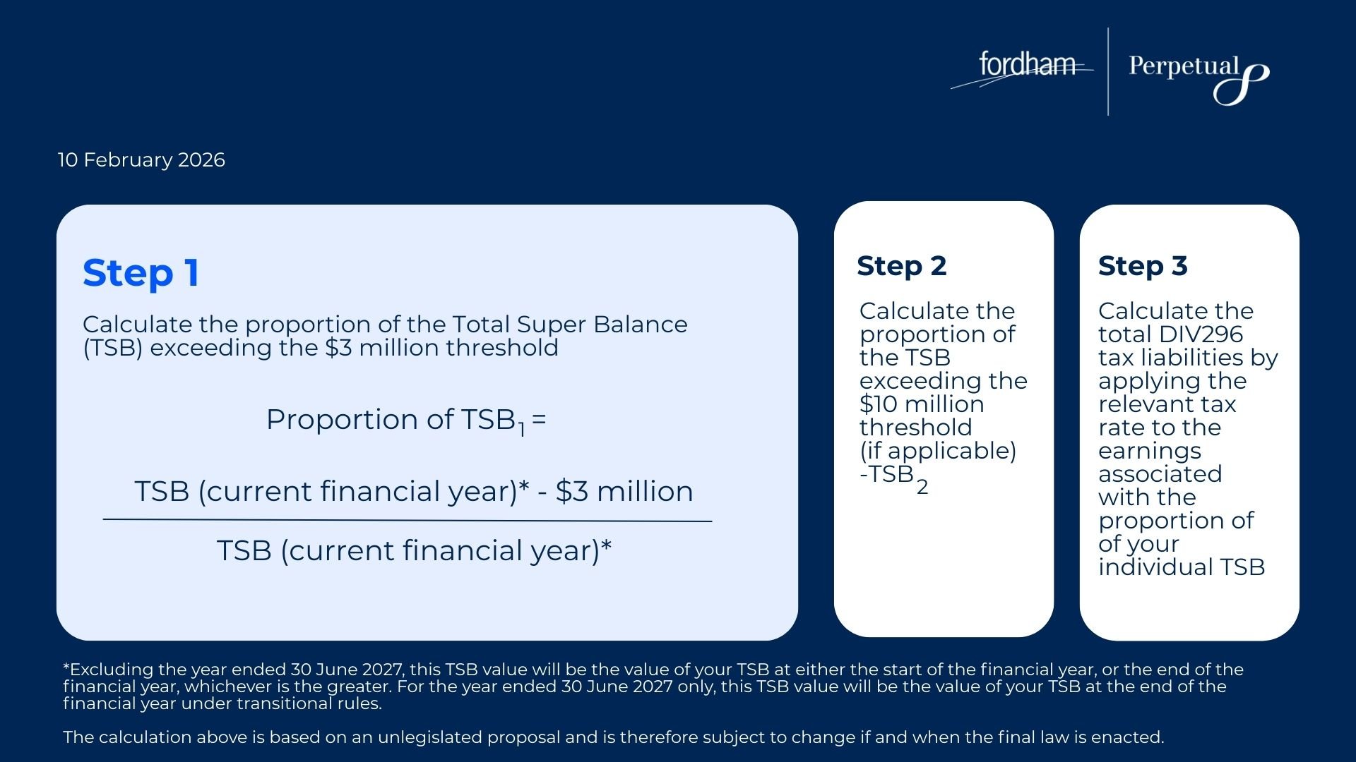 In 2026/2027, the TSB value that will be used for this purpose will be the TSB value at the end of the financial year. However, from the 2027/28 financial year onwards, an individual’s TSB at both start and end of the financial year will be assessed for the Division 296 Tax purposes, with the higher of the two balances used in the calculation.