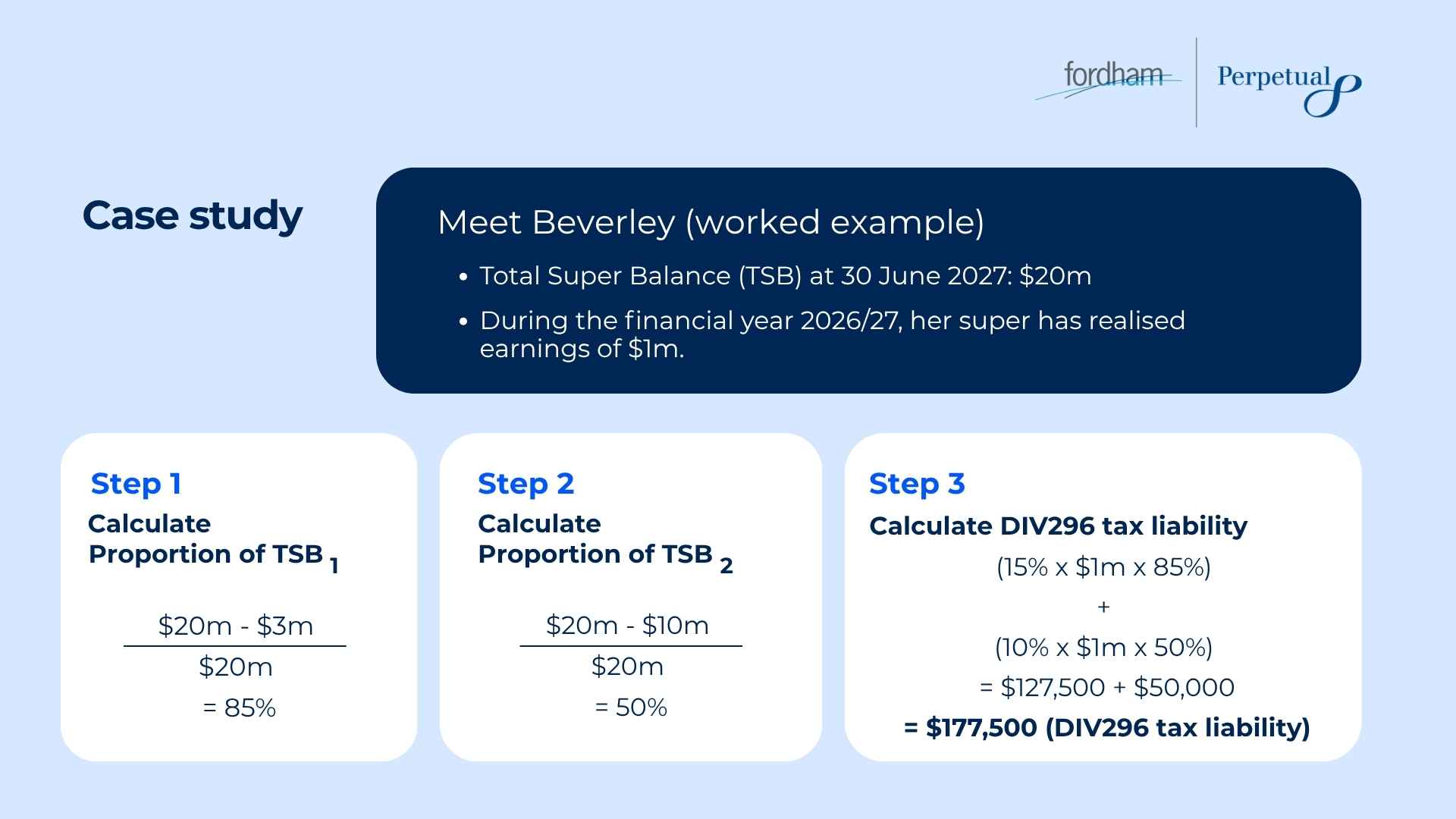 Worked example: Beverley has a Total Super Balance (TSB) of $20m on 30 June 2027. During the financial year 2026/27, her super has realised earnings of $1,000,000. Therefore, the new proposed Division 296 tax is calculated as follows...