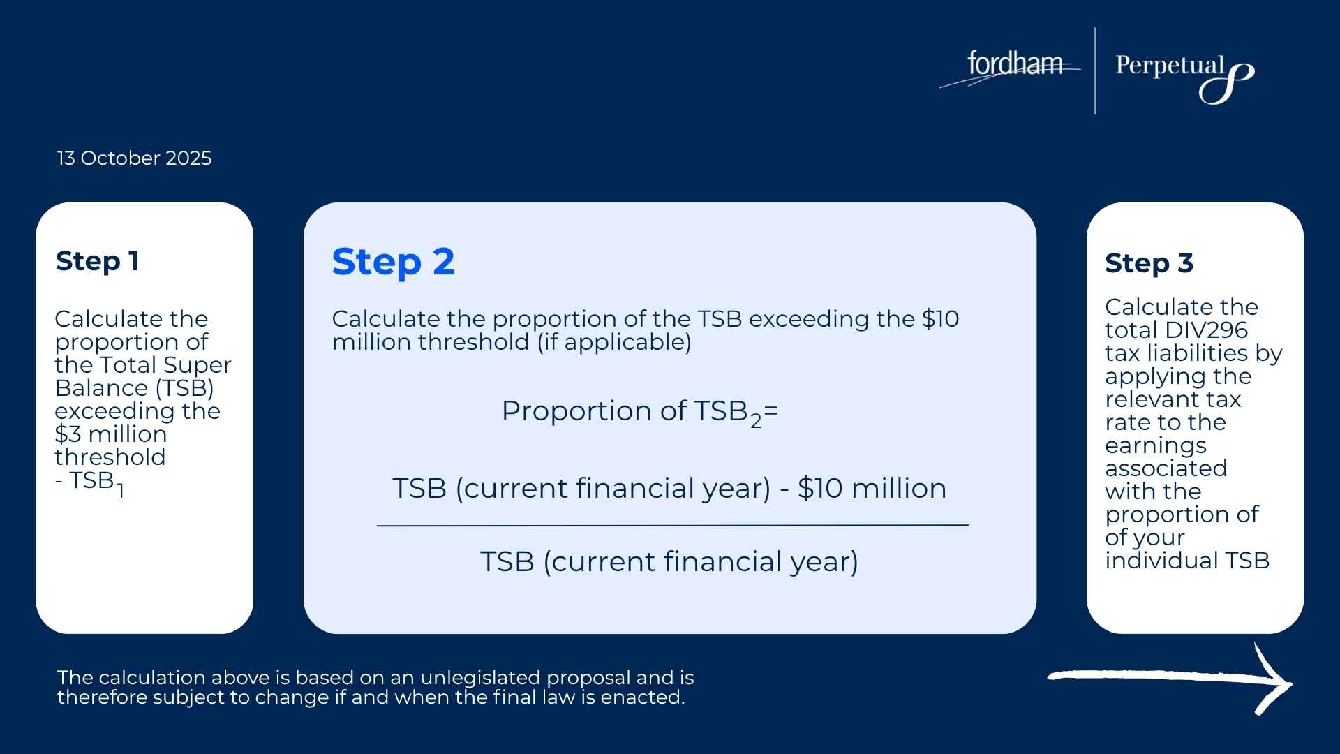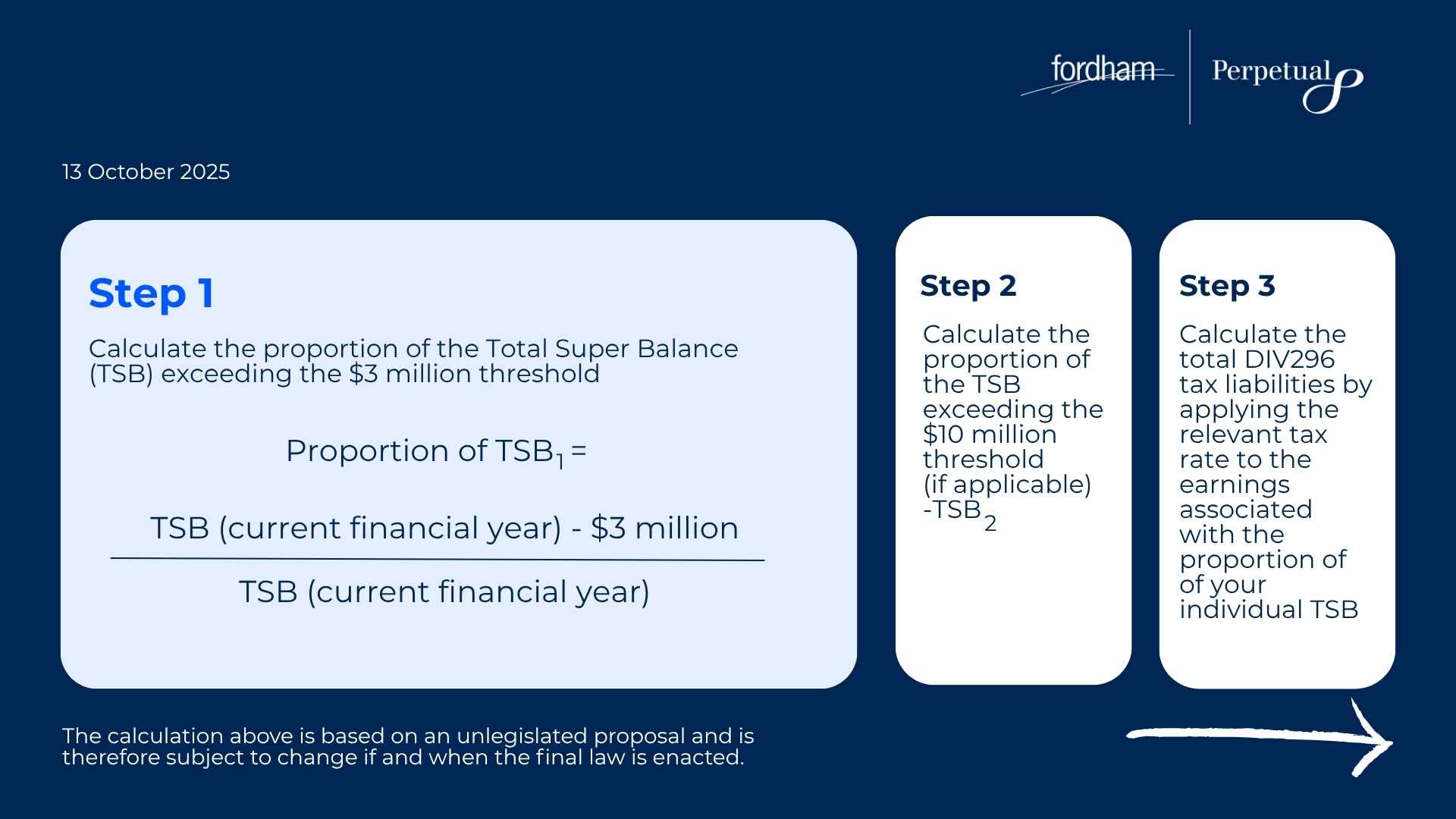 Based on the Treasurer’s announcement on 13 October 2025 regarding the Division 296 tax changes, this tax no longer applies to unrealised capital gains, instead it will be taxing the proportion of realised earnings associated with individual’s total super balance over $3 million.